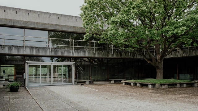 Bygningen er opført i beton og står i et råt og nærmest brutal beton-udtryk og med mange smukke detaljer.