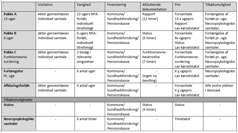 - Fokus på fremadrettet udvikling af funktionsniveau fysisk, psykisk, kognitivt og socialt, men i et erhvervsrettet og aktivitetsbaseret fokus.